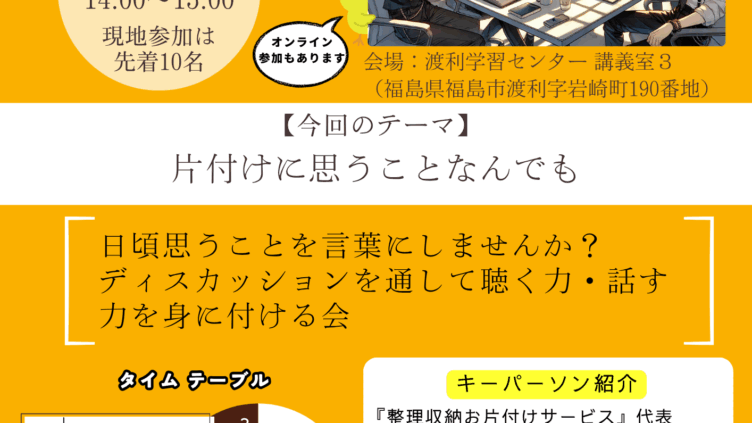 お知らせ 「第10回ディスカッション会(参加無料)」を開催します。 【テーマ】片付けに思うことなんでも<開催概要>日時:2025年11月23日(日)14:00~15:00 ※現地参加は先着10名会場:渡利学習センター 講義室3(福島県福島市渡利字岩崎町190番地)キーパーソン:鈴木暁子さん(『整理収納お片付... お知らせ