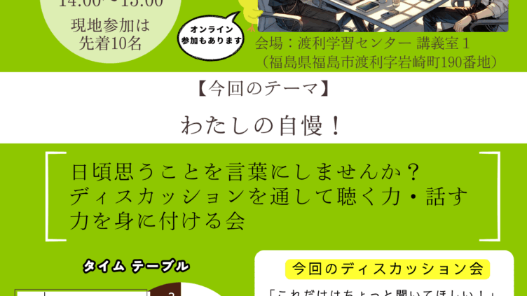 お知らせ 「第9回ディスカッション会(参加無料)」を開催します。 【テーマ】わたしの自慢!<開催概要>日時:2025年10月26日(日)14:00~15:00 ※現地参加は先着10名会場:渡利学習センター 講義室1(福島県福島市渡利字岩崎町190番地)お申し込みはこちらからお願いします。オンライン(Zoo... お知らせ